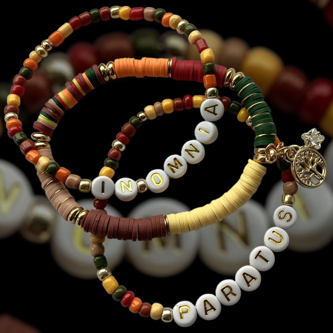 Step into every season with courage and readiness with the In Omnia Paratus Bracelet Stack. Handmade with earthy autumnal beads in rich tones of red, orange, green, and mustard, this trio carries the Latin phrase “In Omnia Paratus” — meaning “Ready for anything.” Finished with gold-tone charms, it’s a bold and inspiring piece for the season.